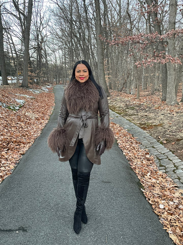 An elegant twist on a classic, our Blair Leather and Mongolian Fur Coat or Fox Fur Coat in Chocolate Brown features a stunning exaggerated 100% real Mongolian or Fox Fur collar. Warm and a statement piece for the winter months. Premium winter outerwear combining elegance and warmth. Shop designer fur coats.