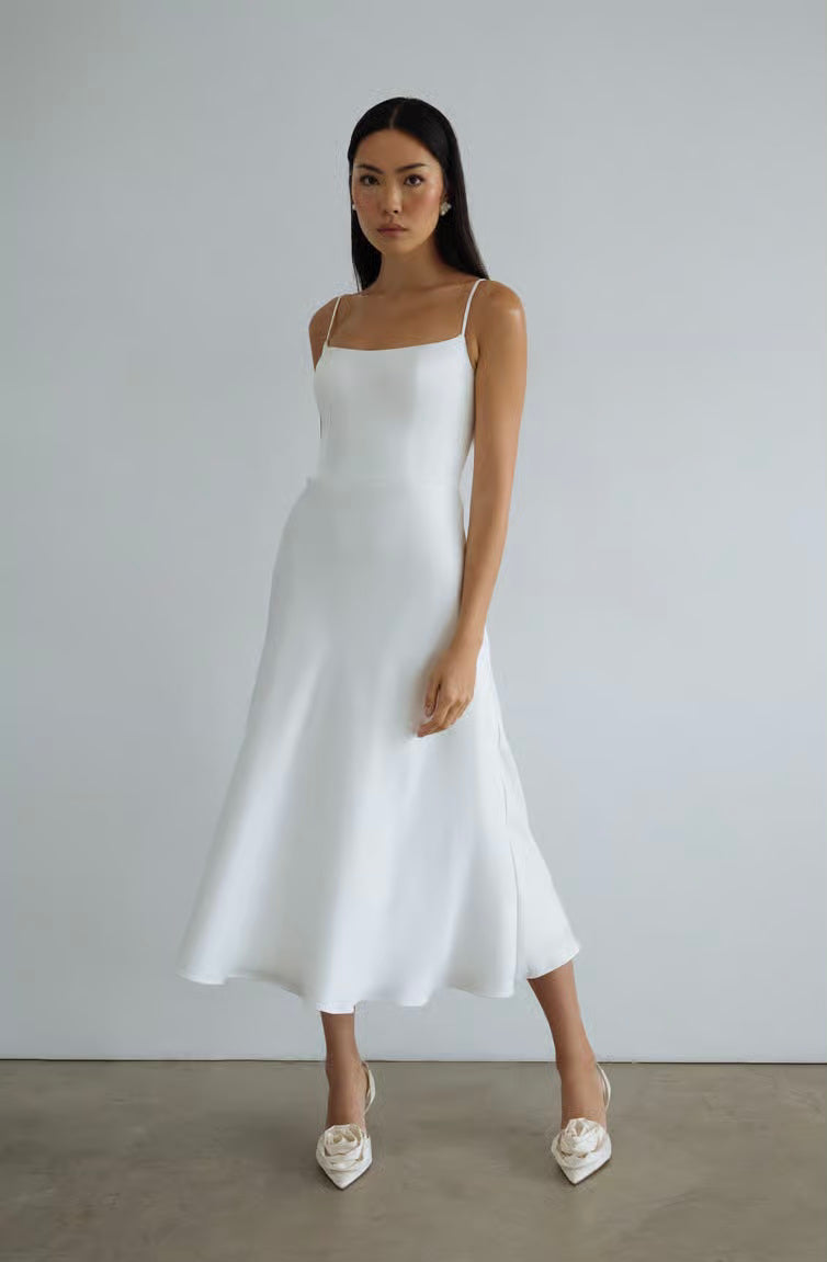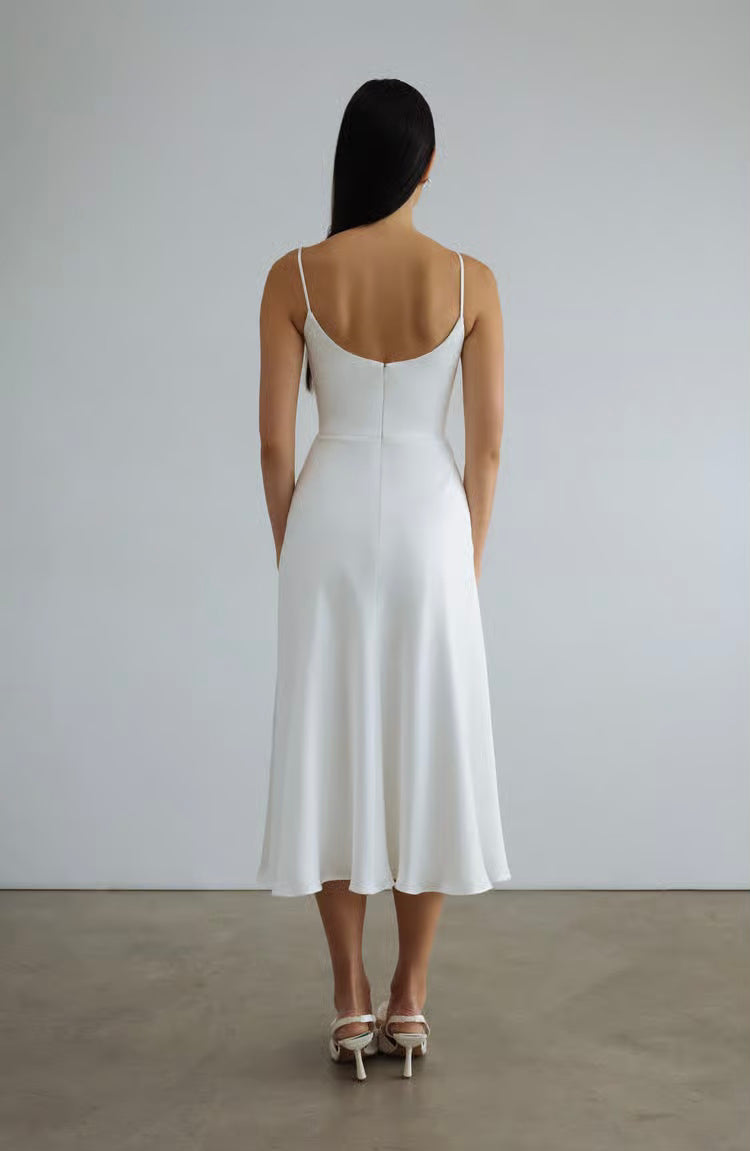This midi-length silhouette is tailored to flatter, with a fitted bodice that enhances the waist and a softly flared skirt that creates graceful movement. Clean lines and thoughtful seaming provide a polished look, making it perfect for weddings, cocktail parties, formal events, or special celebrations.