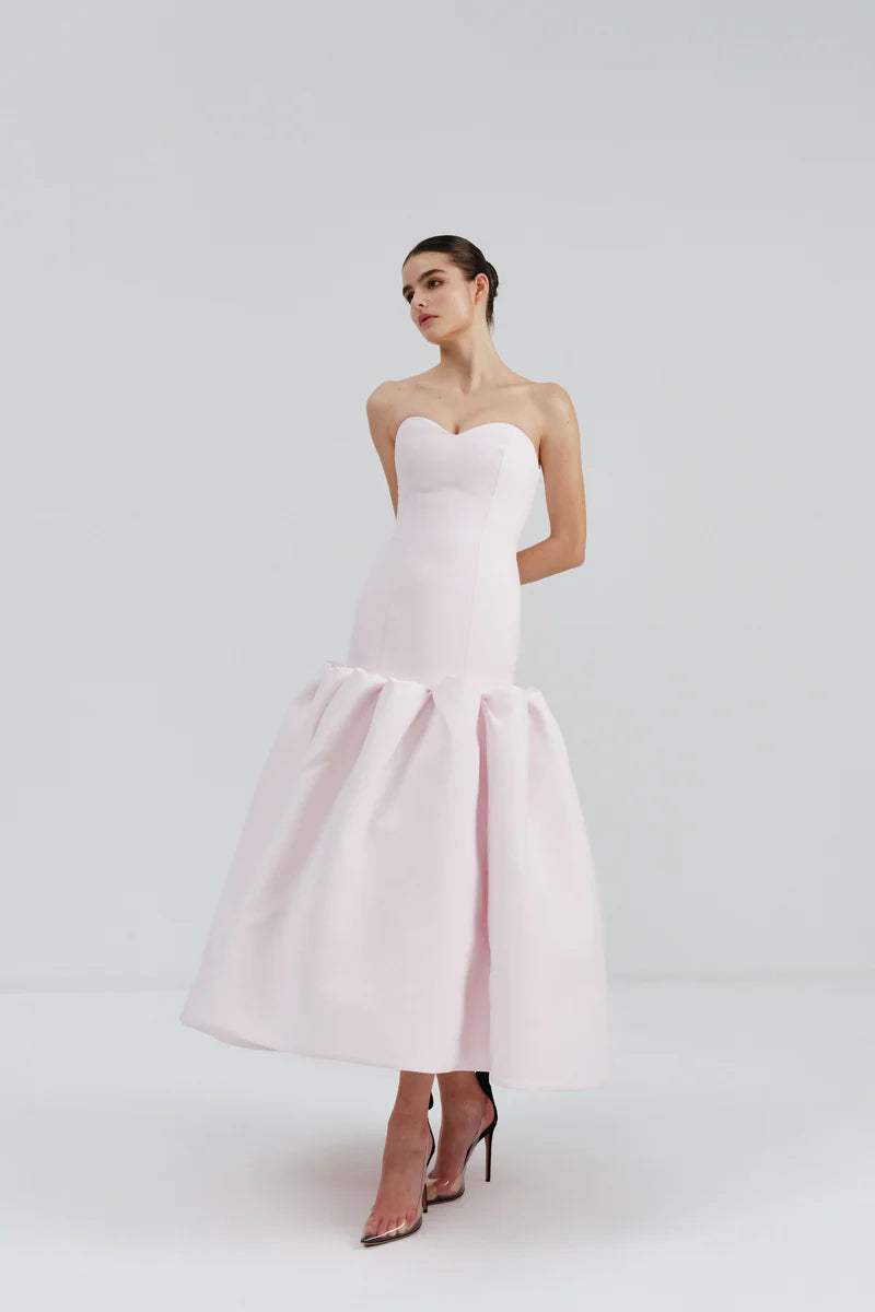 The structured bodice creates a flattering, contoured silhouette, while the midi-length skirt falls gracefully with just the right amount of volume. Thoughtful tailoring enhances the waistline, delivering a polished, feminine profile that transitions effortlessly from formal occasions to elevated evening events.