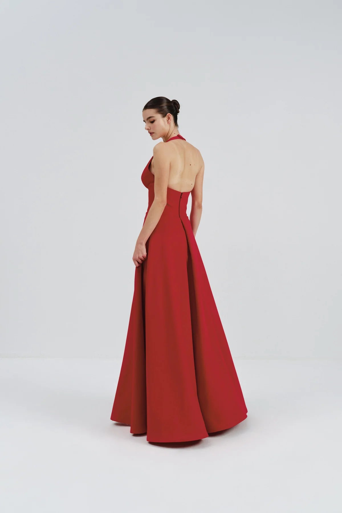 The halter neckline frames the shoulders with effortless grace, creating a flattering, elongated look. A fitted bodice enhances the waist before flowing into a dramatic full-length skirt, offering movement and elegance with every step. The subtle sheen of the mikado fabric adds a refined touch, making it perfect for formal occasions, weddings, galas, civil weddings, courthouse weddings, and black-tie events.