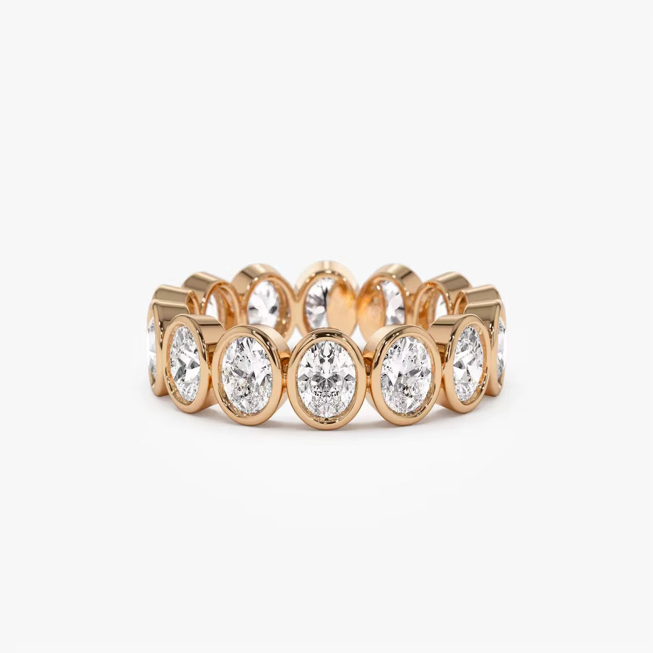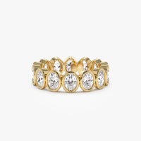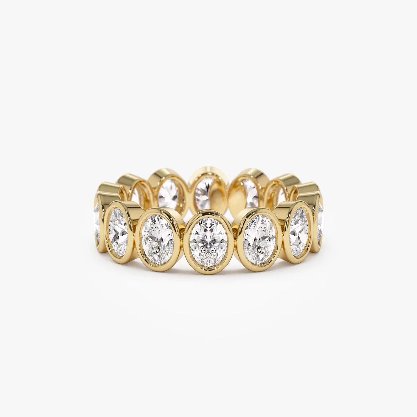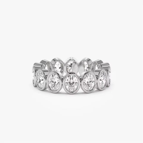 A modern take on a classic design with ultra-glamorous fancy oval bezel set eternity band (4ctw.). This ring is crafted from high-quality Moissanite and is designed for durability and all-day comfort. Perfect as a wedding bracelet, anniversary gift, or a stunning statement piece, it embodies timeless elegance and sophisticated style.