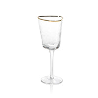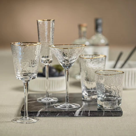 Add an elegant flare with our Porcha Wine Glasses. This design features textured glass rounded triangular rim in 24K gold and elongated thin stems.