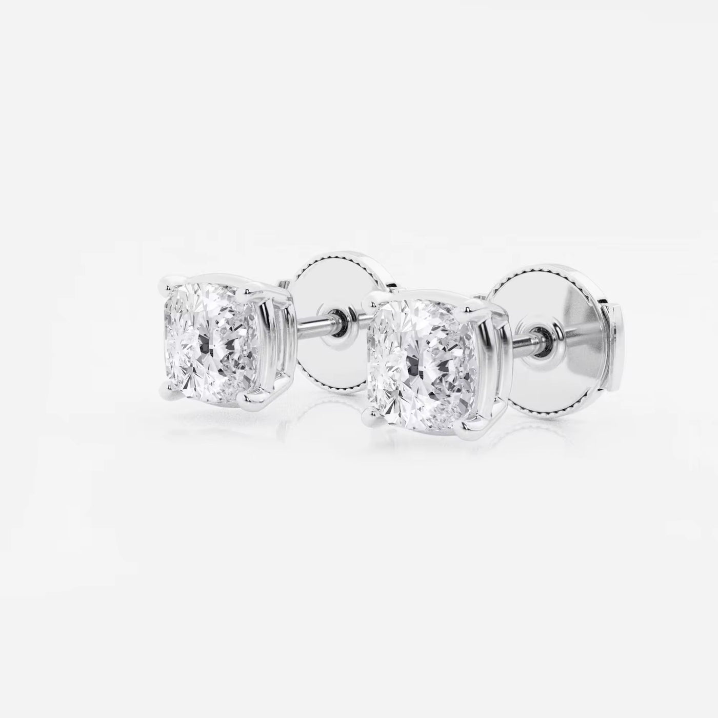 Beautiful Moissanite lady solitaire cushion cut stud earrings make for a stylish touch to any ensemble. Each earring is secured with a guardian back for a safe and comfortable wear.