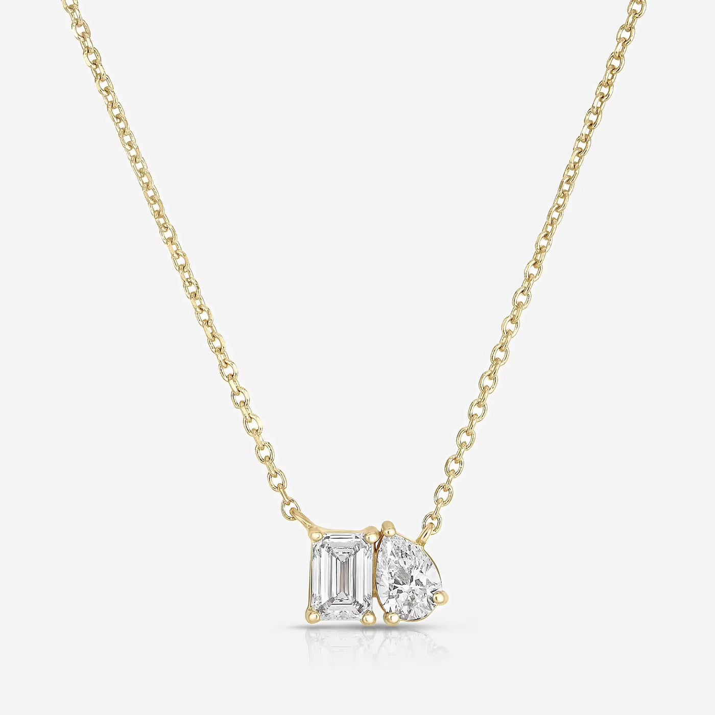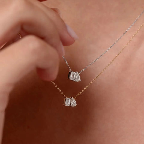 Double the sparkle with our 3.00 cwt. two-stone emerald & pear pendant necklace. Elevate your style with these brightly polished 18K gold vermeil pendant. Sparkling with a diamond like brilliant cut Moissanite exude jubilance.